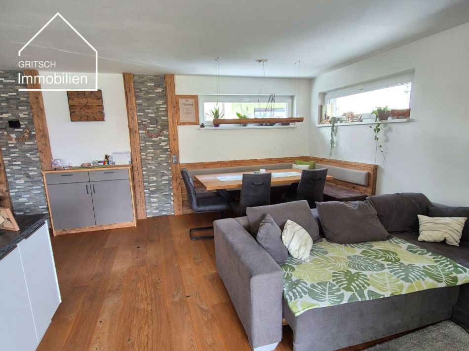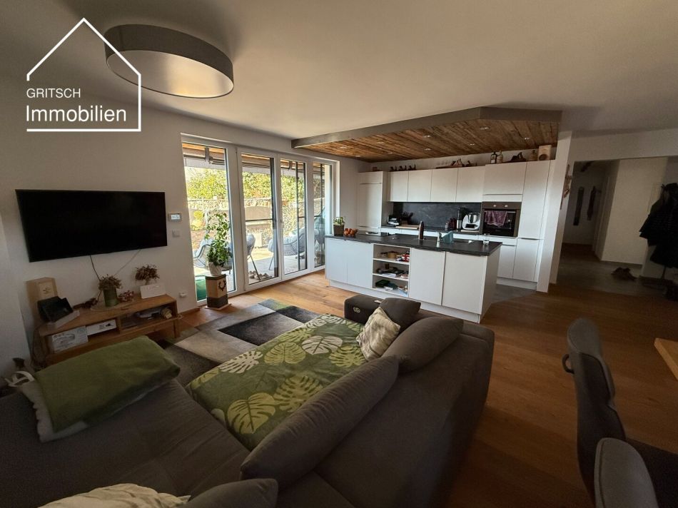 Die 4-Zimmer-Wohnung besticht auf ca. 94m² Wohnnutzfläche durch einen offenen Grundriss mit vollausgestatteter Wohnküche sowie einem hellen Wohn-Essbereich mit Zugang zur sonnigen Terrasse und dem rund 80 m² großen Garten mit traumhaftem Bergblick.