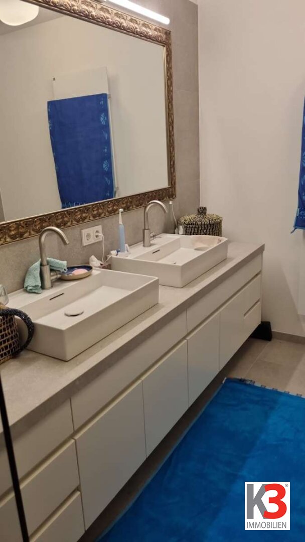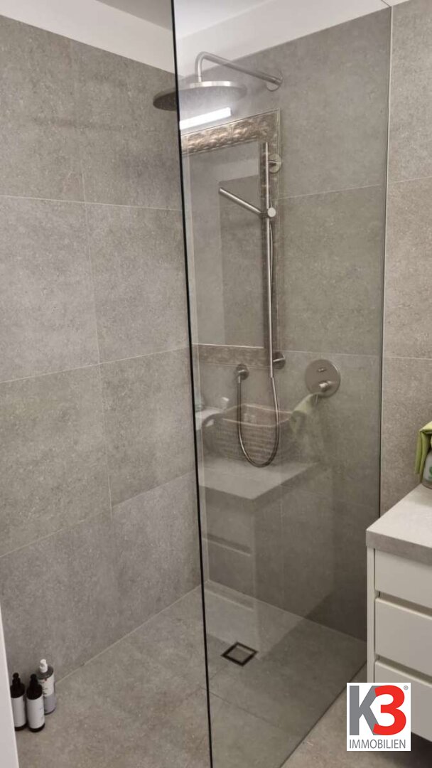 Zwei stilvolle Badezimmer sorgen für Komfort im Alltag – beide mit Dusche, eines davon zusätzlich mit WC.
