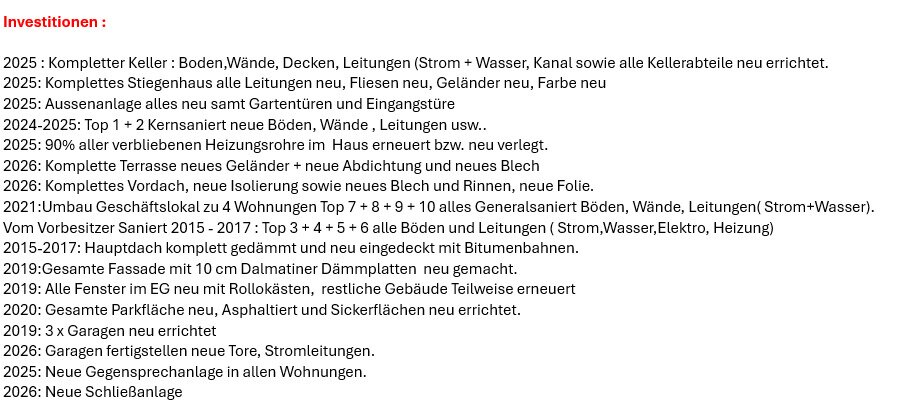 Daraus ergibt sich ein zusätzliches monatliches Nettopotenzial von ca. € 1.520. Bei Vollvermietung ist ein jährlicher Nettoertrag von ca. € 67.684,- und eine Rendite von ca. 5,2 % erzielbar. Der aktuelle jährliche Nettoertrag beträgt € 49.444,–, was einer Rendite von ca. 3,9 % entspricht. Auf Wunsch des Käufers kann sich der Verkäufer gerne noch um die Vermietung der Leerstände kümmern. Außenparkplätze wurden bislang noch nicht zugeteilt, die Garagen befinden sich aktuell in Fertigstellung. Den Bewohnern steht zudem eine allgemeine Terrasse im Obergeschoss zur Verfügung. Das Gebäude wurde in den vergangenen Jahren laufend und mit hohem Qualitätsanspruch saniert. Nahezu alle wesentlichen Bauteile und technischen Anlagen wurden erneuert, darunter das Dach, die gedämmte Fassade, Fenster, sämtliche Leitungen, Heizungsrohre, das Stiegenhaus, Kellerbereiche sowie die Außenanlagen. Mehrere Wohnungen wurden kern- bzw. generalsaniert und entsprechen einem zeitgemäßen Wohnstandard. Die vorhandenen Küchen und Badezimmermöbel stehen im Eigentum des Verkäufers und sind im Kaufpreis enthalten.