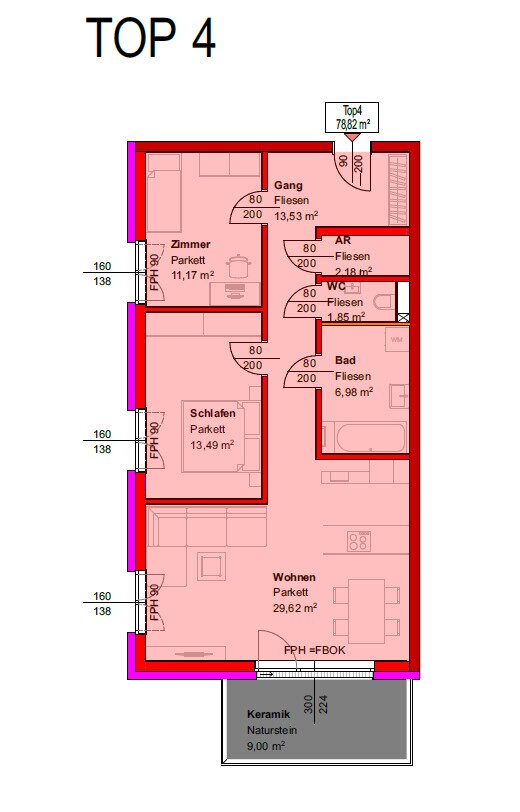 Vorraum - Abstellraum - Wohnküche - Badezimmer - getrenntes WC – Schlafzimmer – Kinderzimmer - Terrasse