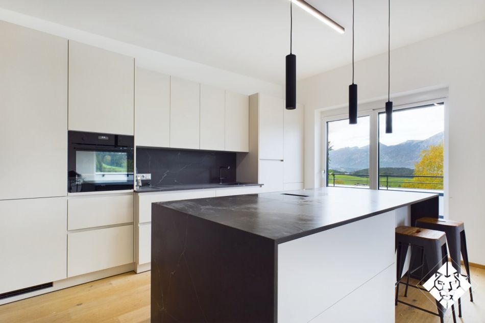 Die neue, maßgefertigte Küche mit modernster Ausstattung lädt dazu ein, die offene und lichtdurchflutete Raumgestaltung zu genießen.