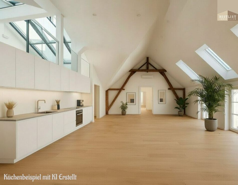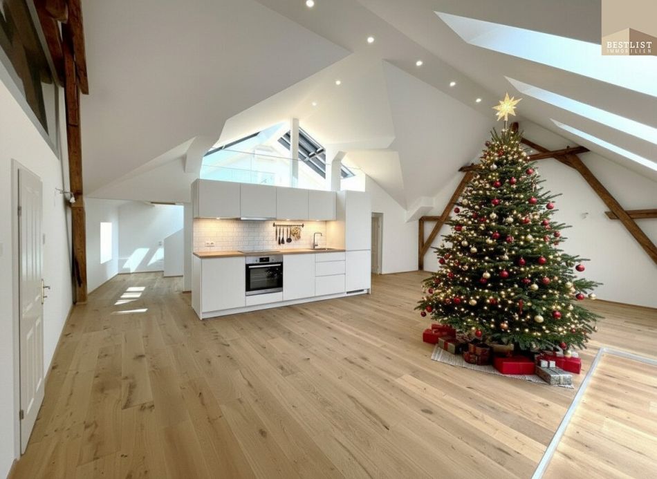 Öffnet man die Eingangstüre und betritt die Wohnung, gelangt man in den geräumigen Vorraum. Unmittelbar en suite befindet sich das Herzstück der Wohnung: ein eindrucksvoller Wohn-Essbereich. Hier stehen bereits alle Anschlüsse zur Verfügung, um den eigenen Küchentraum zu realisieren. Die wunderschönen alten Holzbalken ziehen sofort die Blicke auf sich, die beeindruckende Raumhöhe vermittelt ein Gefühl von Großzügigkeit, Leichtigkeit und maximaler Helligkeit.