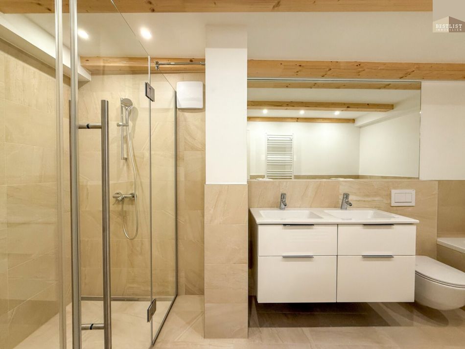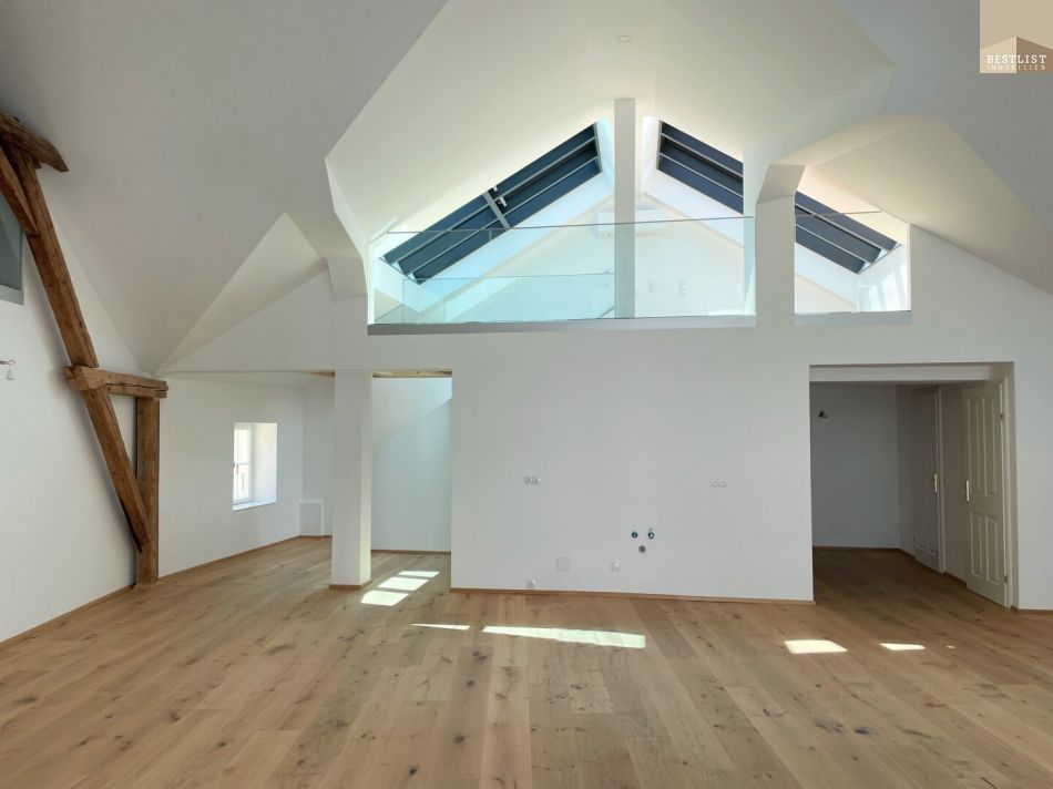 Highlights sind der direkte Liftzugang in die Wohnung, ein fixer Parkplatz im Innenhof, beeindruckende Raumhöhen mit sichtbaren Holzbalken sowie ein offener Wohn-/Essbereich mit ca. 71 m². Die großzügige Terrasse lädt zum Entspannen mit Blick auf den Mühlbach ein.