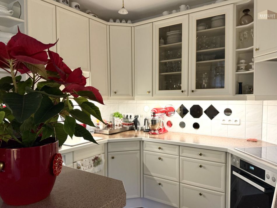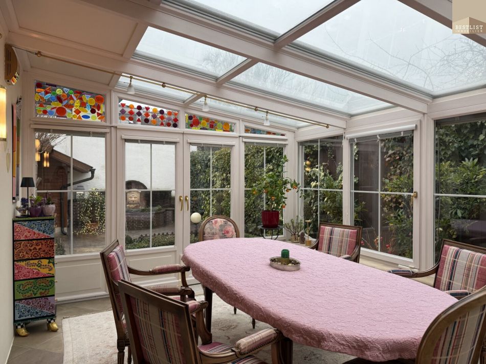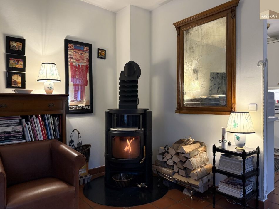 Die offene, weiße Küche im Landhausstil fügt sich harmonisch in das Wohnkonzept ein. Der angrenzende Wohnbereich besticht durch seine Gemütlichkeit und wird durch einen Schwedenofen zu einem besonders einladenden Ort – ideal für entspannte Abende. Der anschließende Wintergarten dient als lichtdurchflutetes Esszimmer und schafft eine wunderbare Verbindung zwischen Innen- und Außenraum.