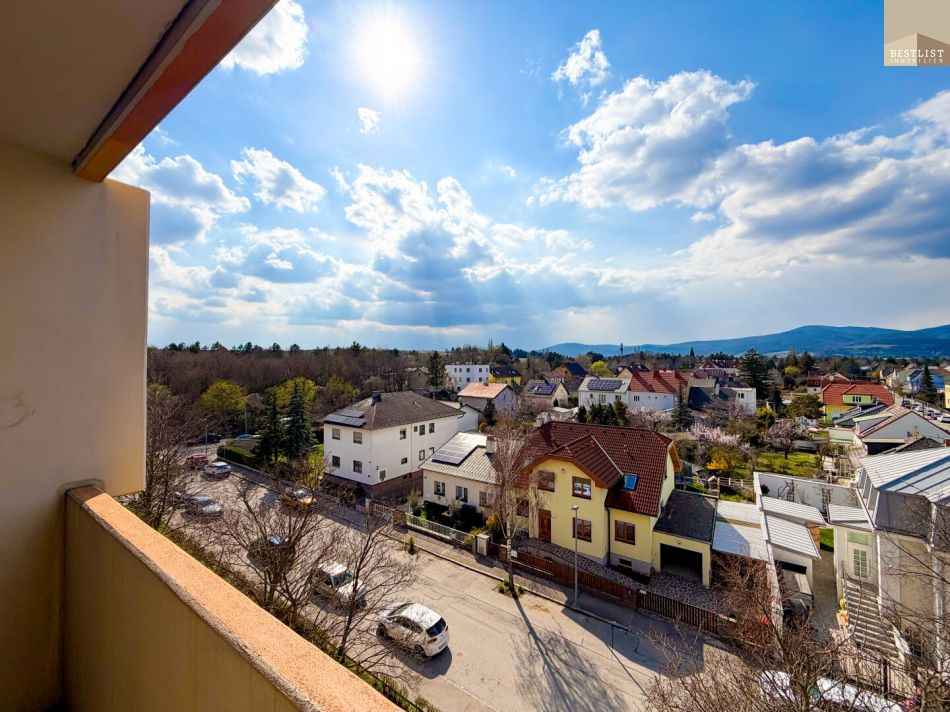 Rechterhand entlang des Flurs gelangt man in das helle und einladende Wohnzimmer mit direktem Zugang zur westseitigen Loggia. Diese bietet ideale Voraussetzungen für entspannte Abendstunden in der Sonne und eröffnet einen beeindruckenden Ausblick über ganz Baden – vom Mitterberg bis hin zum Schneeberg bei klarer Sicht.