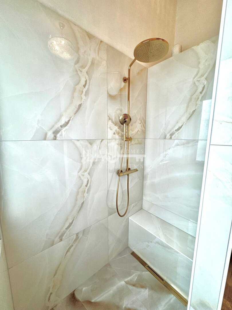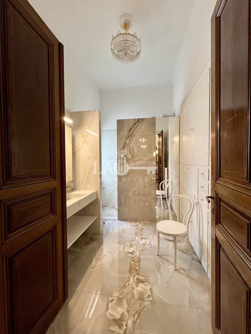 Eine Symbiose aus wunderschönen, hohen Flügeltüren und Tafelparkett wurde geschickt durch die hochwertige Badezimmerausstattung ergänzt.