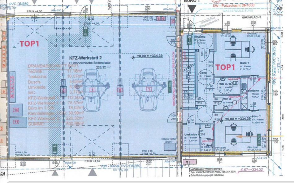 Zur Vermietung steht eine moderne Gewerbeimmobilie TOP 1 bestehend aus einer großzügigen Werkstatt mit angrenzenden Büro- und Sozialräumen. Das Gebäude vereint Funktionalität, hochwertige Ausstattung und eine durchdachte Raumaufteilung – ideal für Handwerks-, Dienstleistungs- oder KFZ-Betriebe. Im Erdgeschoss befindet sich die große Werkstatt mit einer Gesamtfläche von rund 226 m². Sie ist mit zwei Arbeitsplätzen, einer monolithischen Bodenplatte und allen notwendigen technischen Anschlüssen ausgestattet. Ergänzend dazu stehen Nebenräume wie Technikraum, Teeküche, Dusch- und Umkleidebereich, WC sowie ein separates Büro zur Verfügung. Die gesamte Erdgeschossfläche umfasst ca. 317m². Das Obergeschoss bietet weitere Büroflächen mit einer Gesamtgröße von rund 85m². Hier sind mehrere Büroräume, ein Archiv, eine Teeküche sowie getrennte Sanitäranlagen untergebracht. Zum Objekt gehören zudem drei KFZ-Stellplätze, die sich direkt vor dem Bürogebäude befinden. Die hellen, gut geschnittenen Räume schaffen ein angenehmes Arbeitsumfeld und eignen sich sowohl für Verwaltung, Planung als auch Kundenbetreuung. Die Immobilie überzeugt durch ihre moderne Bauweise, funktionale Struktur und flexible Nutzungsmöglichkeiten. Dank der Kombination aus Werkstatt und Büroflächen ist sie ideal für Unternehmen, die Produktion, Service und Verwaltung unter einem Dach vereinen möchten. Geheizt wird die Immobilie mittels Luftwärmepumpe.