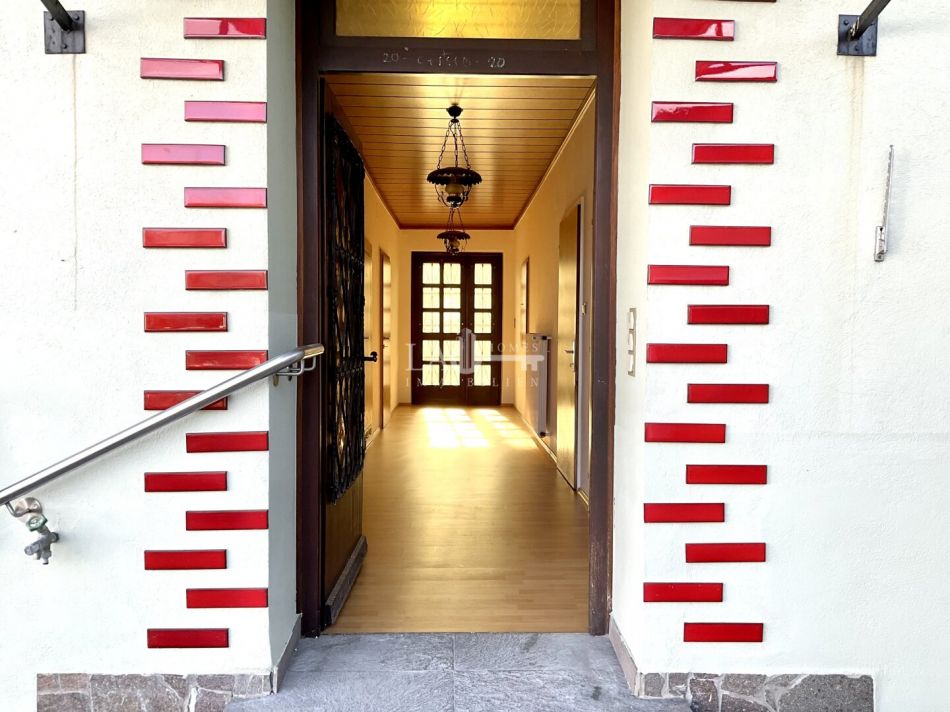 Das Gebäude hat zwei Eingänge und besteht aus zwei separaten Wohneinheiten, die durch einen zentralen Mittelgang getrennt sind.