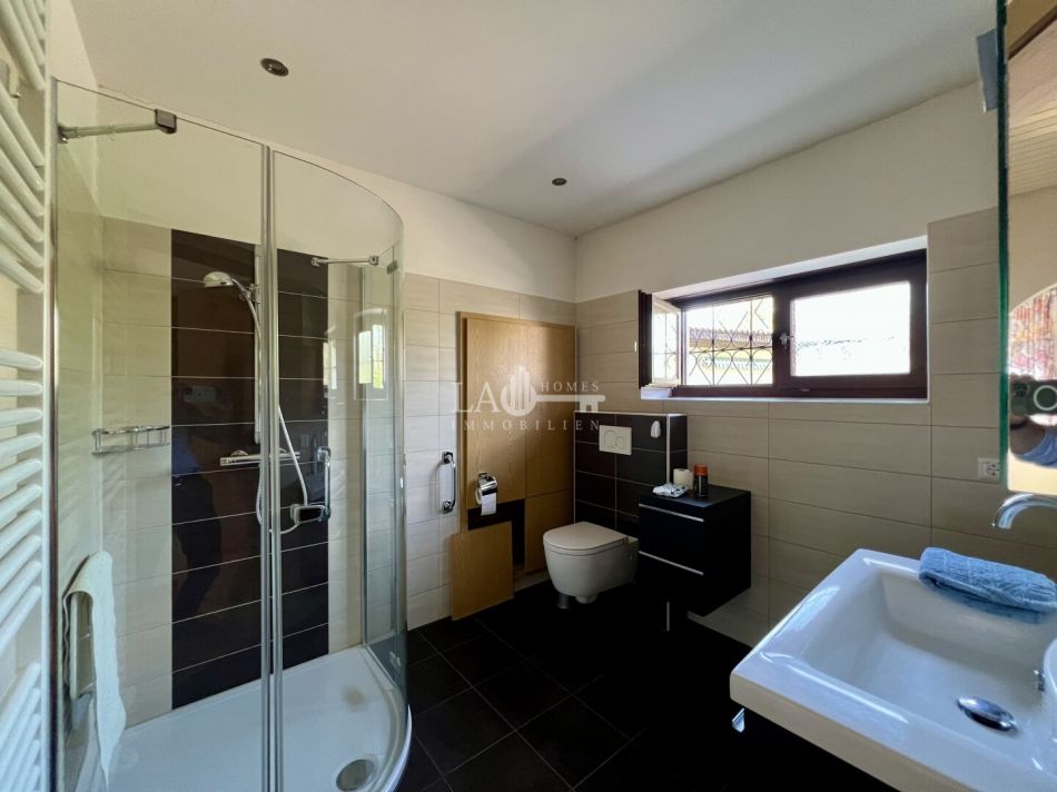 Die Wohneinheit 1 gliedert sich auf in einer Ess-Küche, Wohnzimmer, Schlafzimmer, Bad mit Dusche, WC inkl. Tageslichtfenster,