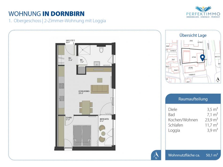 Die Wohnung befindet sich im ersten Obergeschoß eines modernen Wohnhauses und ist bequem mit dem Personenaufzug erreichbar. Eine Loggia erweitert den Wohnraum nach außen und bietet einen angenehmen Rückzugsort mitten in der Stadt. Hier lässt es sich mit einer Tasse Kaffee in der Morgensonne perfekt in den Tag starten. Die zentrale Lage in Dornbirn ermöglicht kurze Wege zu Einkaufsmöglichkeiten, Gastronomie, öffentlichen Verkehrsmitteln und vielfältigen Freizeitangeboten.