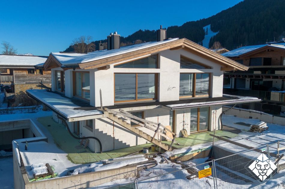Hier oben fühlt sich jeder willkommenen, warmen Materialien, ein Holzofen, eine vollausgestattete Küche, sowie eine Wohnlandschaft sind unter dem massiven Sichtdachstuhl in einem völlig offenen Raum vereint und blicken gemeinsam durch Panoramafenster auf das Highlight - den Wilden Kaiser. Dieser Ausblick begleitet Sie immer, unverbaubar bei allem, was Sie in diesem Haus machen. Egal, ob Sie in der Lese-ecke die Lesebrille auf der Nasenspitze sitzen habend mit einem leichten Blick über den Brillenrahmen nach oben schauen, oder beim Frühstückskaffee und frischem Brötchen in Gedanken schwelgen, Sie sehen den Kaiser! Noch näher kommen Sie diesem, wenn Sie die großen, massiven Schiebefenster bei sternenklarer Nacht öffnen und auf den riesigen Balkon gehen, um mit Ihrem Partner auf die gelungene Kaufentscheidung anzustoßen. Alles richtig gemacht.