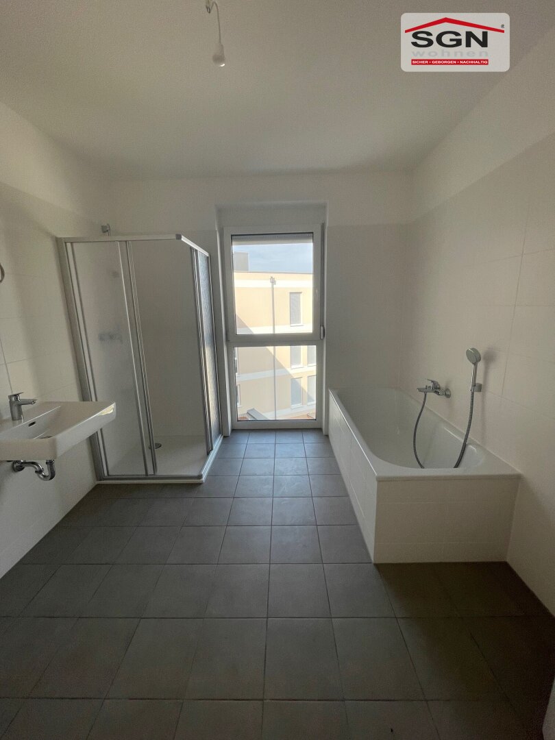 Das lichtdurchflutete Badezimmer ist mit Fenster, Badewanne, Dusche, Waschbecken, WC und Waschmaschinenanschluss bestens ausgestattet und lässt keine Wünsche offen.