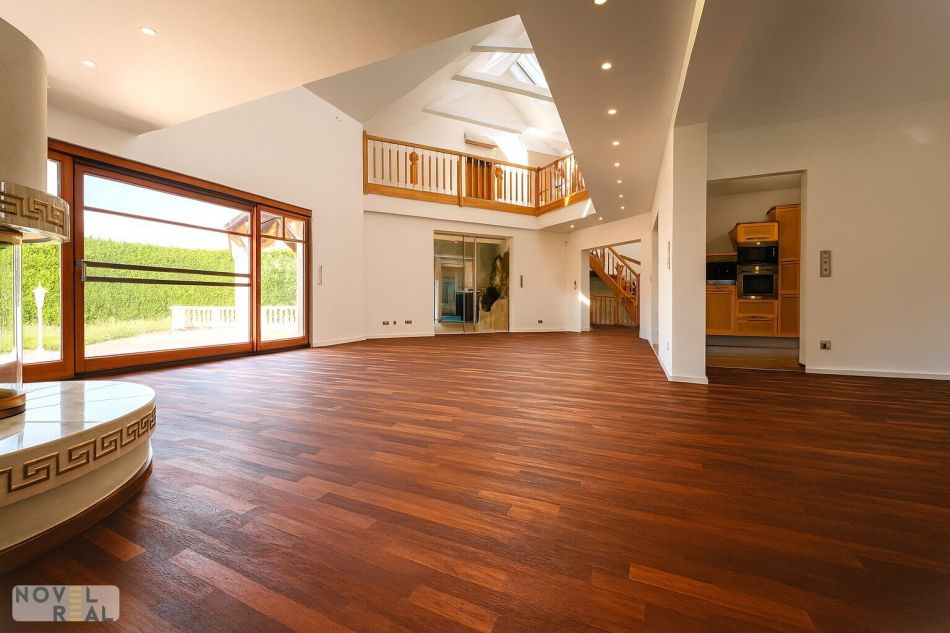 Diese außergewöhnliche Liegenschaft vereint stilvolle Architektur mit erlesenem Wohnkomfort und präsentiert sich als wahres Refugium für anspruchsvolle Genießer. Eingebettet in eine traumhafte Grünlage vor den Toren Wiens erstreckt sich das Anwesen über drei Etagen und beeindruckt mit einem großzügig angelegten, gepflegten Garten sowie einem außerordentlichen Wellnessbereich – ein Paradies der Ruhe und Privatsphäre.Die mittlere Wohnebene besticht durch einen offenen, lichtdurchfluteten Wohnraum mit großflächigen, bodentiefen Panoramafenstern und weit öffnenden Türen, die einen atemberaubenden Blick ins Grüne freigeben. Die umlaufende Galerie verleiht dem Raum Großzügigkeit und Offenheit – sie schafft spannende Blickbeziehungen und unterstreicht das luftige Wohngefühl.