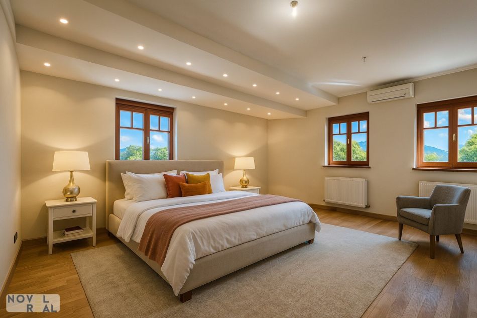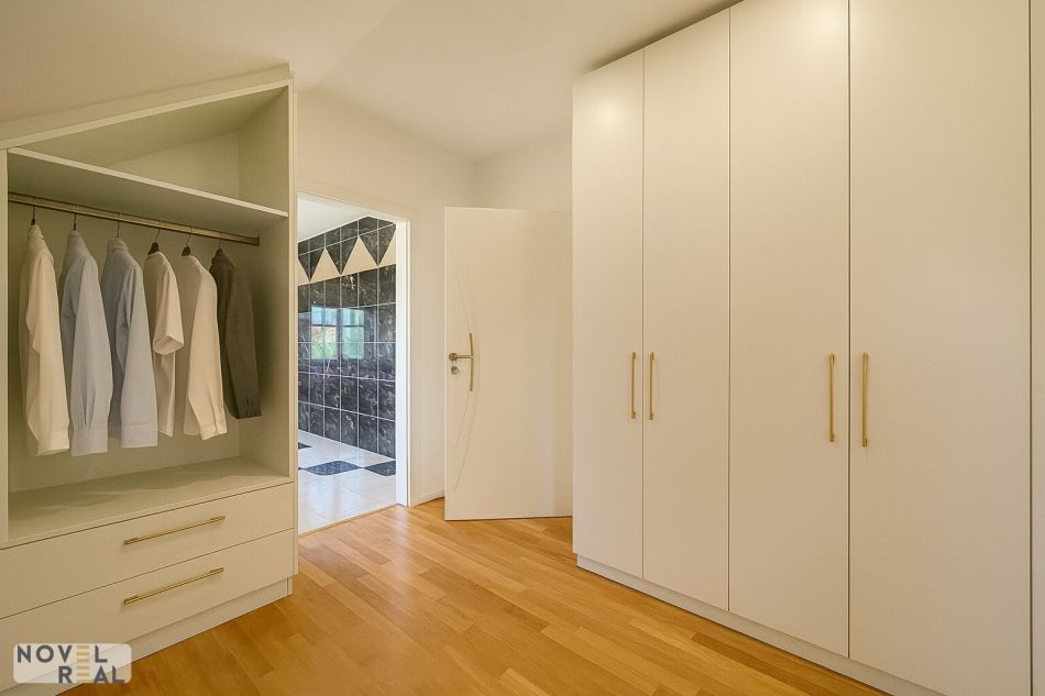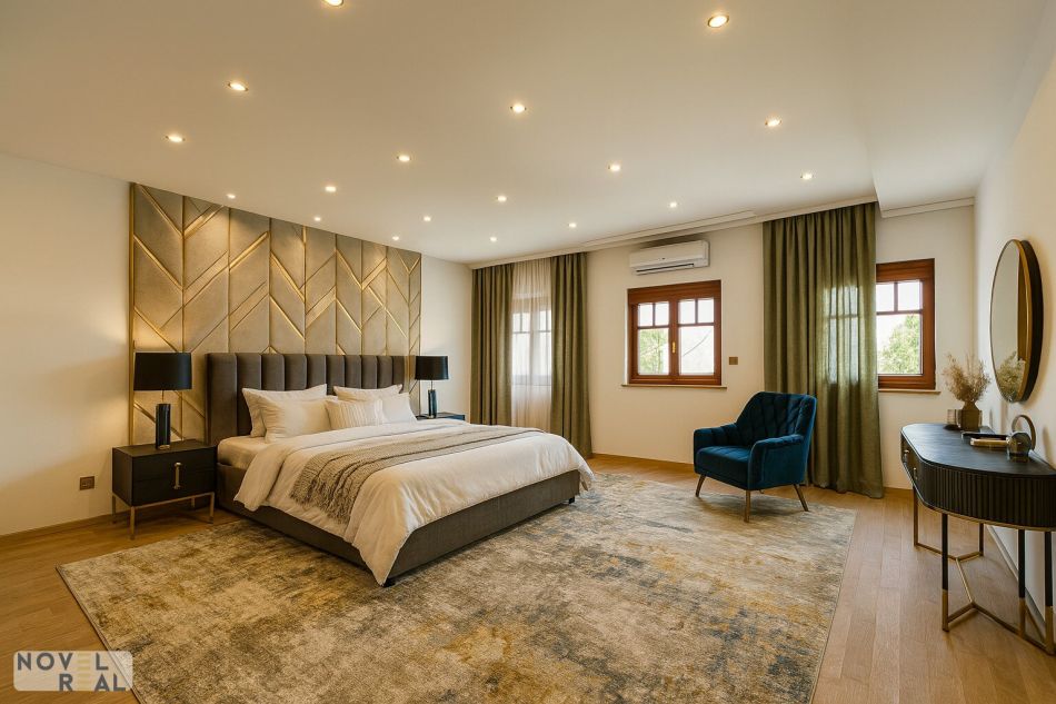 Im oberen Geschoss erstrecken sich mehrere großzügige Räume, ergänzt durch eine exklusive Master Suite entworfen im Versace Design. Jedes Zimmer beeindruckt mit einem eigenen, hochwertig ausgestatteten Badezimmer. Großflächige Fensterfronten durchfluten die Räume mit Licht und eröffnen einen atemberaubenden Ausblick – ein Wohnerlebnis auf höchstem Niveau