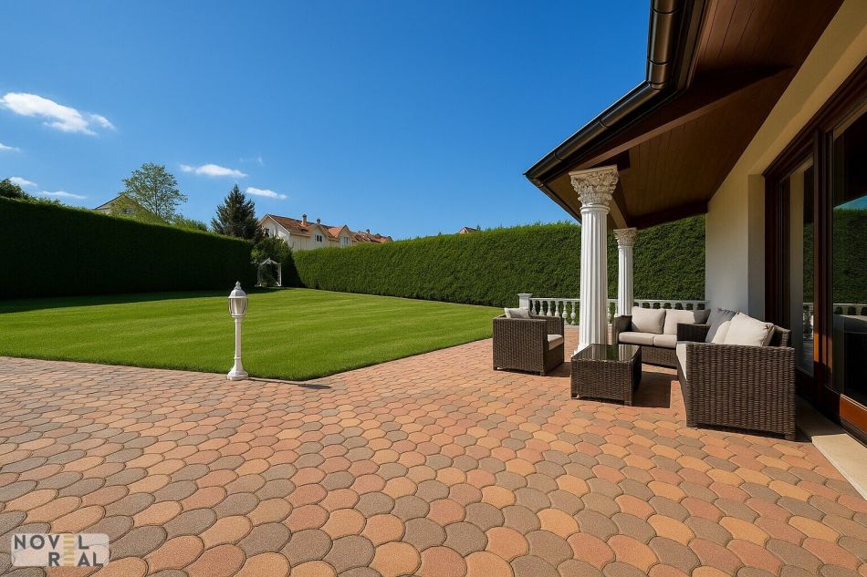 Der Terrassenbereich präsentiert sich in besonders einladender Atmosphäre – hochwertig gestaltet mit Terrakotta-Steinen, die Wärme und mediterranen Charme ausstrahlen.