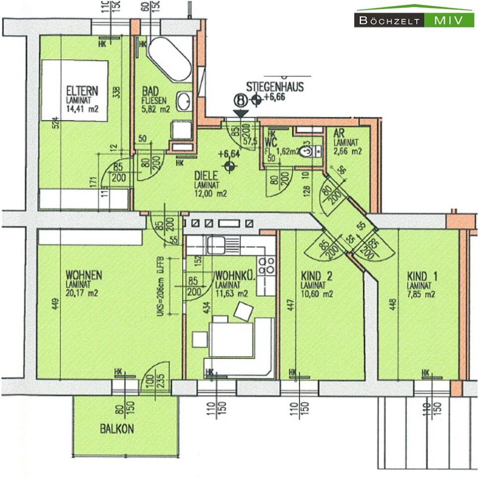 Zur Vermietung gelangt ab 01.01.2026 eine Mietwohnung in Fohnsdorf.Die Wohnung hat eine Größe von ca. 86,76 m² und ist wie folgt aufgeteilt: Vorraum, Küche mit Esszimmer, Wohnzimmer mit Ausgang auf den Balkon, Schlafzimmer, 2 Kinderzimmer, Badezimmer mit Badewanne, separates WC und ein Abstellraum.