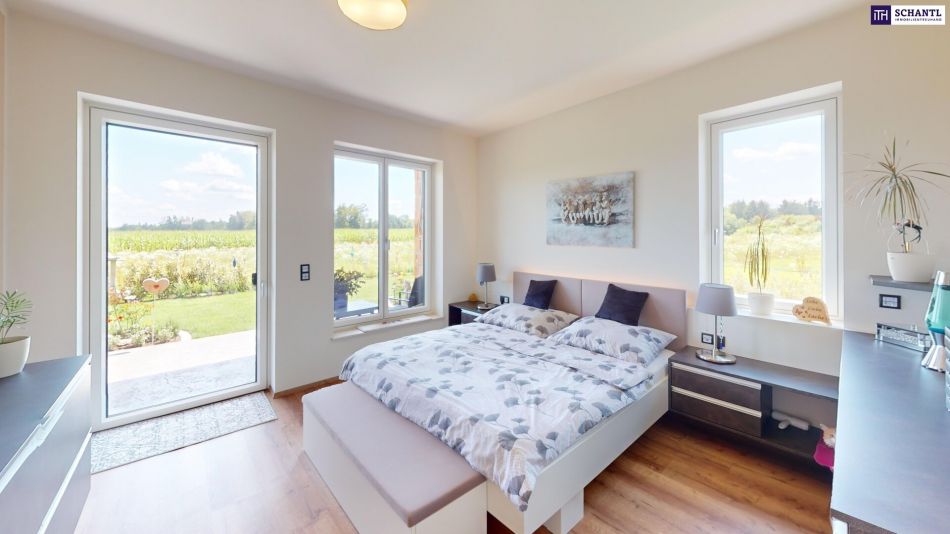 Der Bungalow bietet einen großen Masterbedroom mit eigenem Bad – ausgestattet mit Badewanne, ebenerdiger Dusche und eleganter Keramik. Die Dusche ist extrabreit ausgeführt: sie bietet Platz für zwei oder für Personen, ist aber auch gänzlich barrierefrei ausgeführt. Zwei weitere Räume werden aktuell als Homeoffices genutzt und lassen sich flexibel als Kinder-, Gäste- oder Hobbyzimmer gestalten. Ergänzt wird das Raumangebot durch ein zusätzliches Gästebad mit Dusche sowie ein separates Gäste-WC.