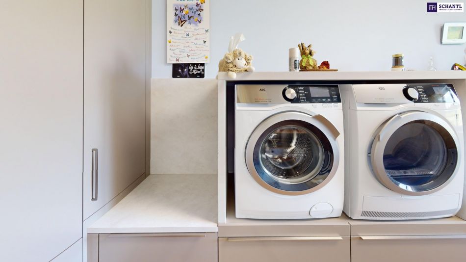 Das Herzstück bildet der lichtdurchflutete Wohn-Essbereich mit Panoramakamin und integrierter, sehr hochwertiger Designküche mit Echtstein-Arbeitsplatte – die liebevoll gearbeiteten Details wie z.B. polierte Steinadern in der Oberfläche und die indirekte Beleuchtung unterstreichen den exklusiven Charakter. Eine separate Vorbereitungsküche, die als Waschküche mit Platz für erhöhte Waschmaschine und Trockner konzipiert wurde, erfüllt höchste funktionale Ansprüche und ist dabei optisch perfekt eingebunden – ein Raum, von dem viele träumen.