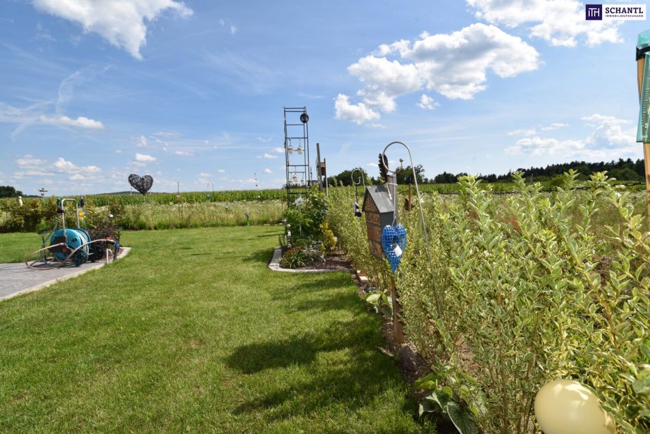 Der liebevoll angelegte Garten wartet mit einer romantischen Schaukel, einer überdachten Terrasse für laue Sommerabende und einer vorbereiteten Fläche für einen Swimmingpool samt unterirdischer Stützmauer auf. Wasseranschlüsse an jeder Ecke, edler Stempelbeton rund ums Haus sowie ein bewilligter Carport (vorbereitet) runden den Außenbereich perfekt ab.