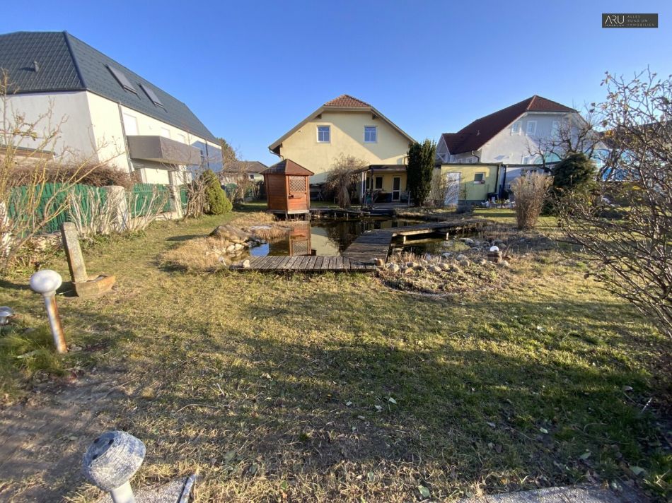 Der Garten ist eine wahre Wohlfühloase: Ein eleganter Schwimmteich bietet nicht nur Erfrischung, sondern auch ein optisches Highlight. Hier lässt sich die Natur in vollen Zügen genießen – ob beim Sonnenbaden, Grillen oder einfach beim Abschalten vom Alltag.