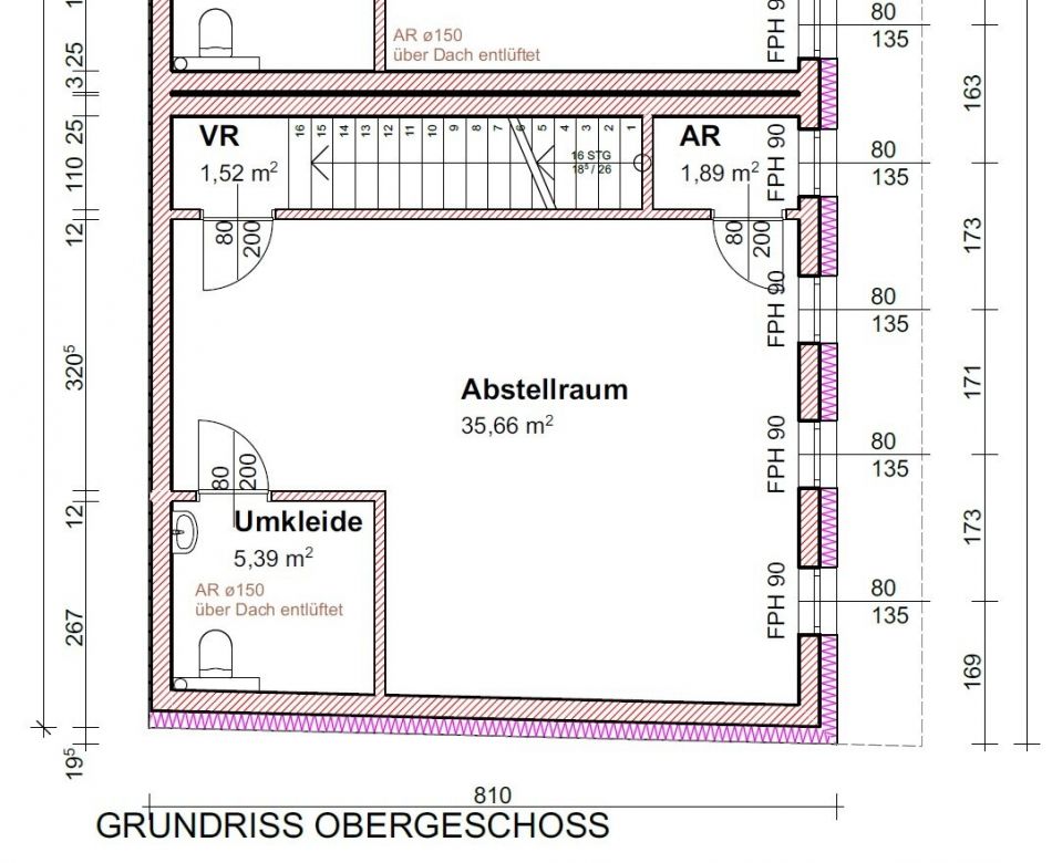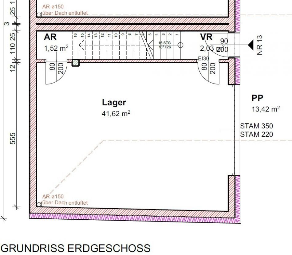 Im Erdgeschoss befindet sich der Eingang und ein elektrisches Garagentor. Im Erdgeschoss ist neben dem Lagerraum (ca. 41,62 m²) auch noch ein Abstellraum (unter dem Stiegenaufgang von ca. 1,52 m²) vorhanden.