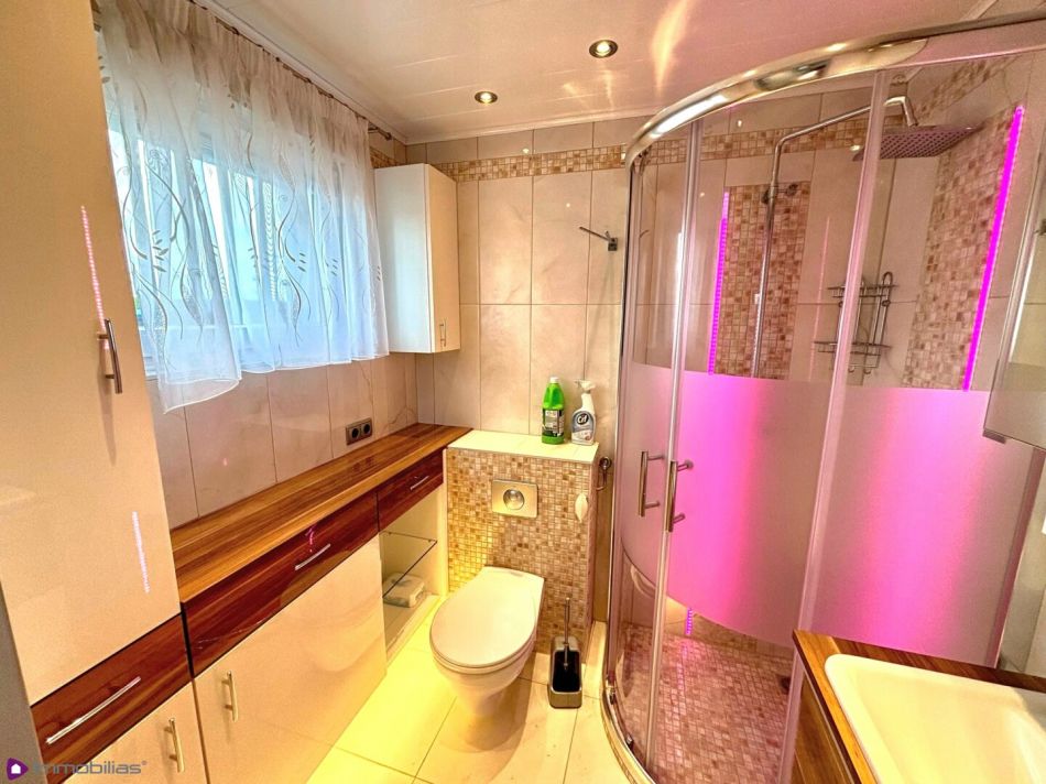 Badezimmer mit Dusche und Waschtisch, WC, mit Fenster, Zugang über Glastür
