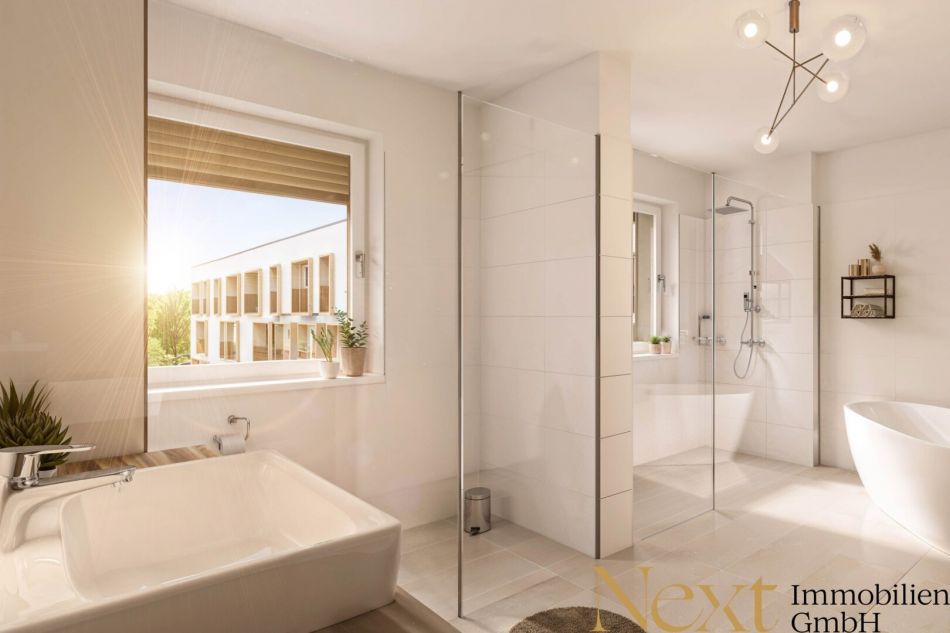 - Badezimmer mit Dusche & freistehender Badewanne, WC, Doppelwaschbecken, Waschmaschinenanschluss, Handtuchheizkörper