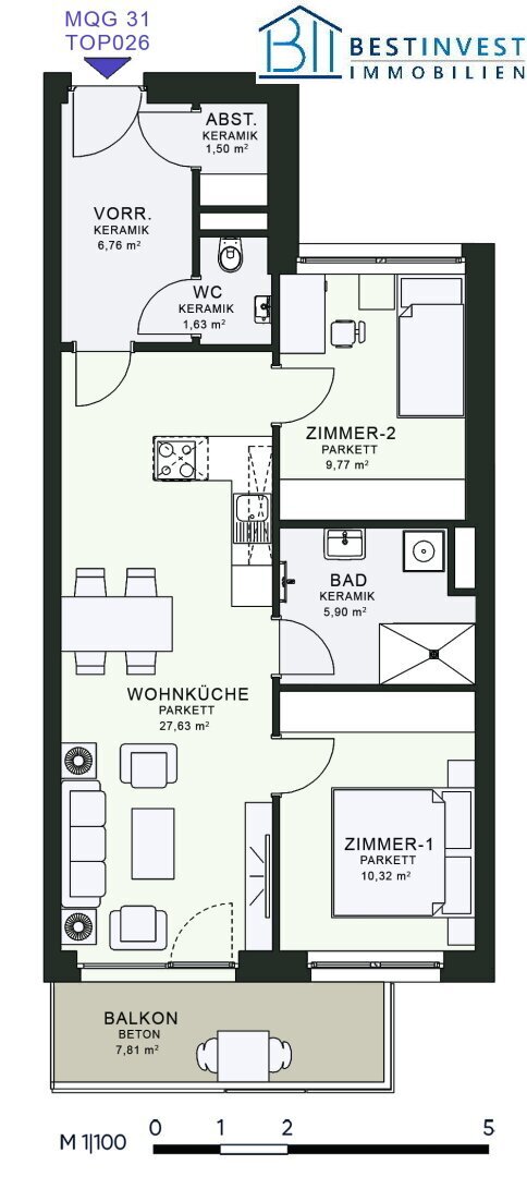 - Die Wohnung wird mit Küche und Badezimmermöbel übergeben, hierfür wird eine Möbelmiete von EUR 44 pro Monat verrechnet. Ansonsten unmöbliert.