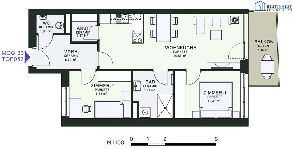 - Die Wohnung wird mit Küche und Badezimmermöbel übergeben, hierfür wird eine Möbelmiete von EUR 44 pro Monat verrechnet. Ansonsten unmöbliert
