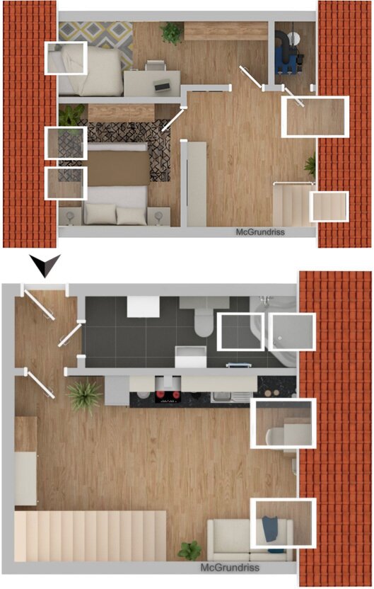Diese Wohnung befindet sich im Dachgeschoss und bietet somit einen fantastischen Rund-Um-Blick. Die 3-Zimmer-Wohnung hat 2 separate Schlafzimmer und eine große Wohnküche auf zwei Ebenen.