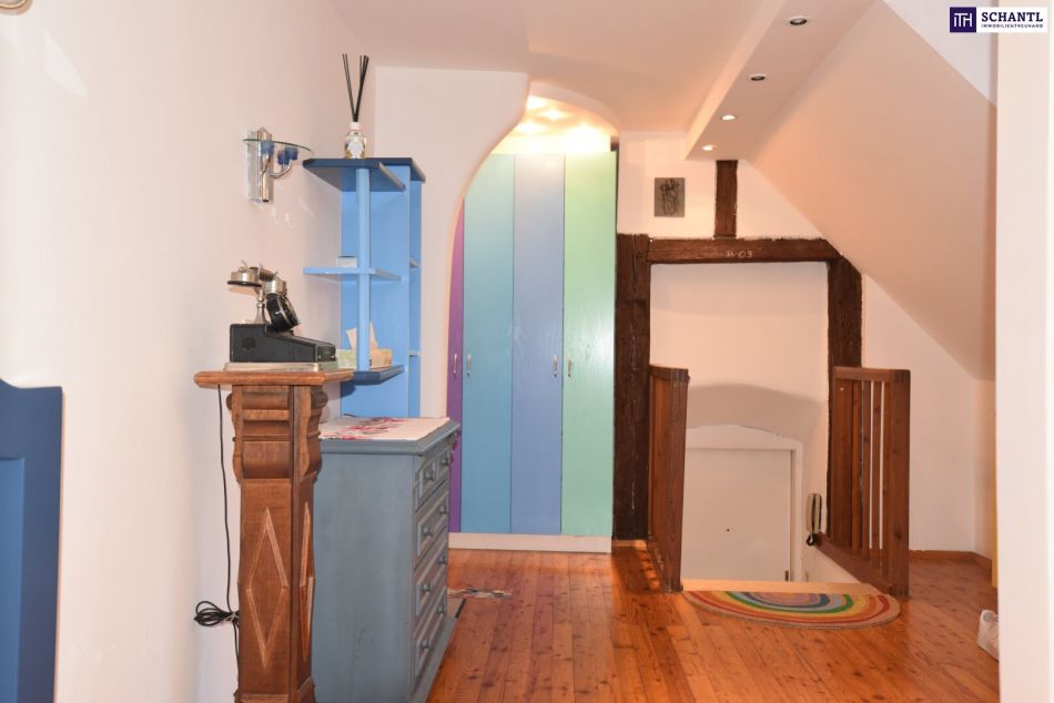 Maßgefertigte Einbauten in den Dachschrägen sorgen für optimalen Stauraum, während historische Details – wie ein gotischer Steintorrahmen und eine barocke Marienkrönungsskulptur – dem Haus besonderen Charme verleihen.
