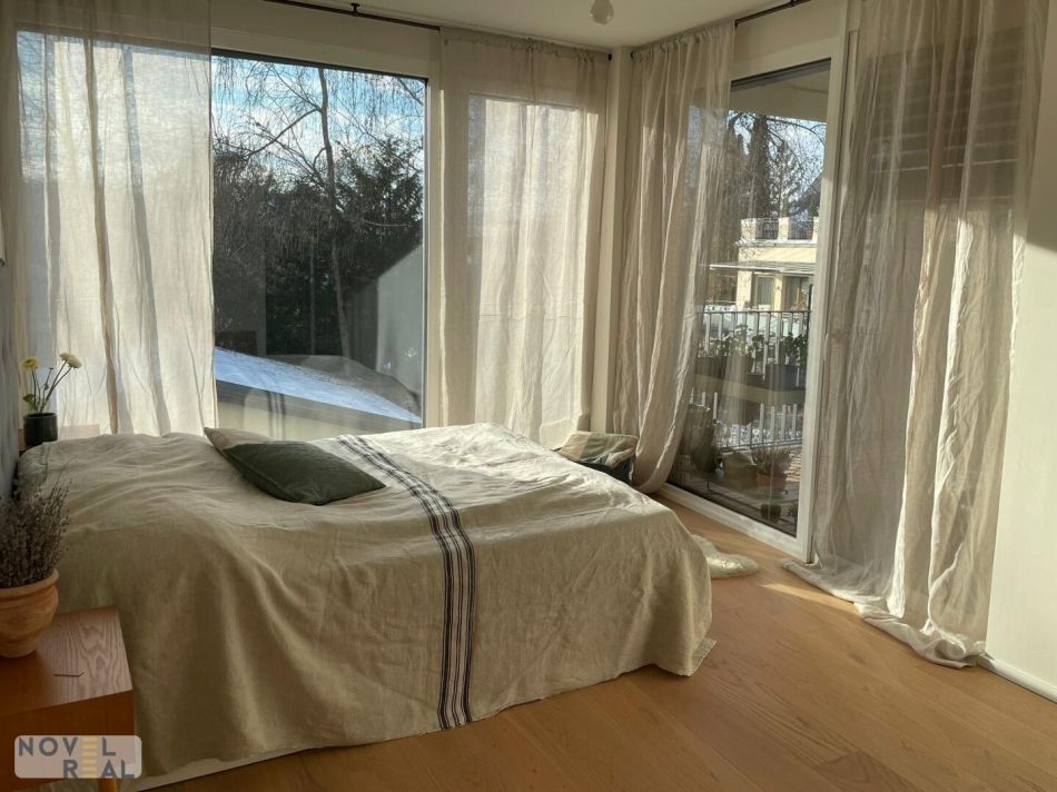 Drei der Zimmer öffnen sich direkt auf den herrlich großzügigen Balkon, der einen traumhaften, unverbauten Ausblick und ein außergewöhnlich luftiges Wohngefühl bietet.