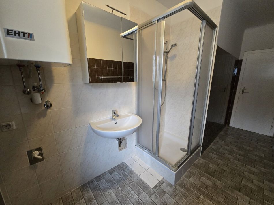 Badezimmer mit Dusche, Fenster, Waschmaschinenanschluss