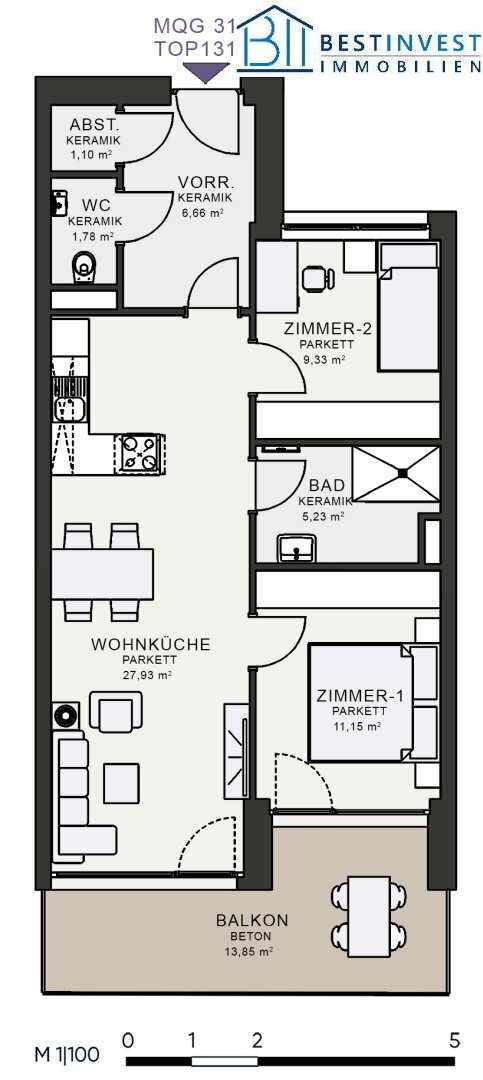 - Die Wohnung wird mit Küche und Badezimmermöbel übergeben, hierfür wird eine Möbelmiete von EUR 48,4 pro Monat verrechnet