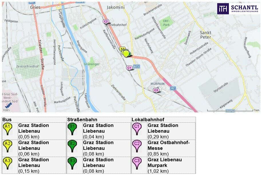 Die Straßenbahn hält direkt vor der Haustür, ebenso ist die A2-Autobahn in unmittelbarer Nähe. Optional besteht die Möglichkeit, einen Tiefgaragenplatz gegen Aufpreis anzumieten. Das Einkaufszentrum Murpark ist fußläufig erreichbar und bietet zahlreiche Nahversorgungs- und Gastronomieangebote.