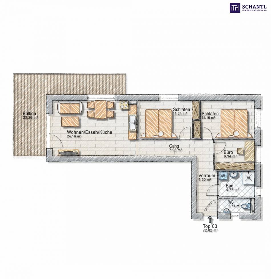- ein kleines Büro mit 6,34m² welches natürlich auch als Schrankraum umfunktioniert werden kann
