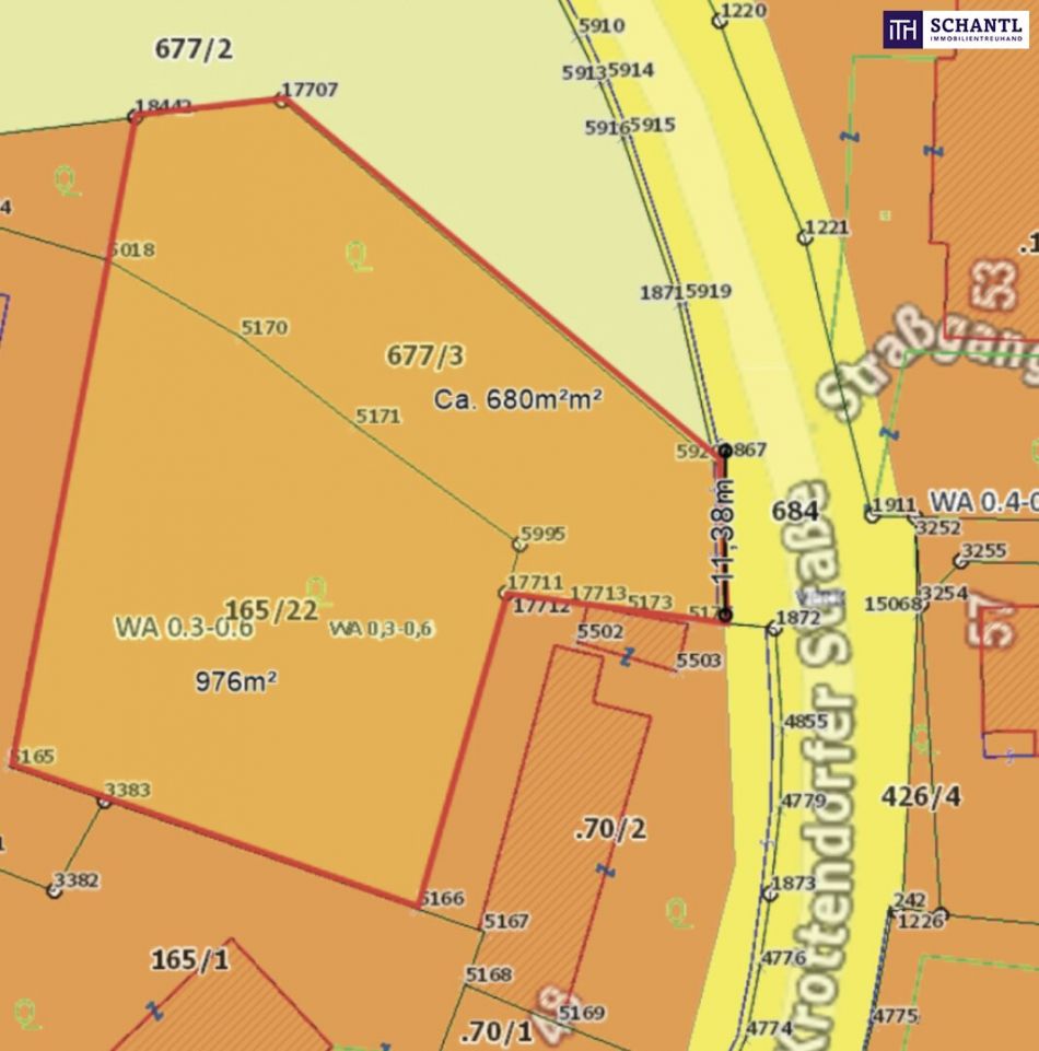 Das Grundstück 677 /3 grenzt im Osten, auf einer Zufahrtsbreite von ca. 11 m, an die Krottendorfer Straße und befindet sich diese Straße im öffentlichen Gut. Eine Mischnutzung für Anlegerwohnungen in den unteren Bereichen, und der Einzelverwertung qualitativ hochwertigerer Wohneinheiten im oberen Bereich eines Mehrparteienhauses, ist gut umsetzbar.