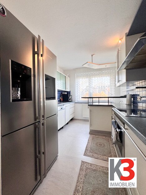 Küche - Ein zweiflügeliges Fenster sorgt in diesem Raum für viel Tageslicht. Die Küche ist neben dem Side-by-Side Kühlschrank ausgestattet mit einem Geschirrspüler, einem Kochfeld, einem Backofen, einer Dunstabzugshaube sowie einer Mikrowelle. Am Küchenende, vor dem Fenster, wurde eine Küchenbar mit Hochstühlen eingerichtet. Drei bis vier Personen können hier durchaus Platz finden zum Trinken und Essen.