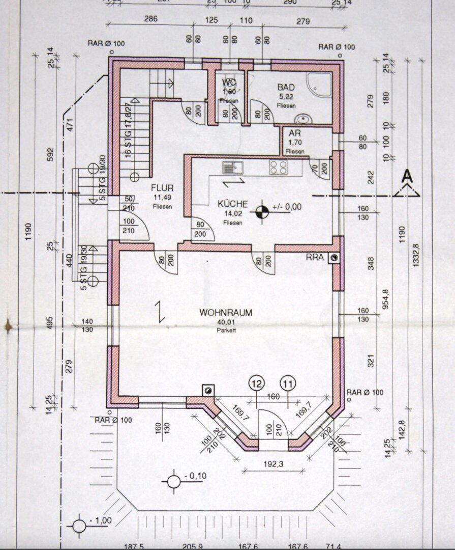- ein 40 m2 großes Wohnzimmer mit Ausgang zur zirka 22 m2 großen Terrasse und zum Garten