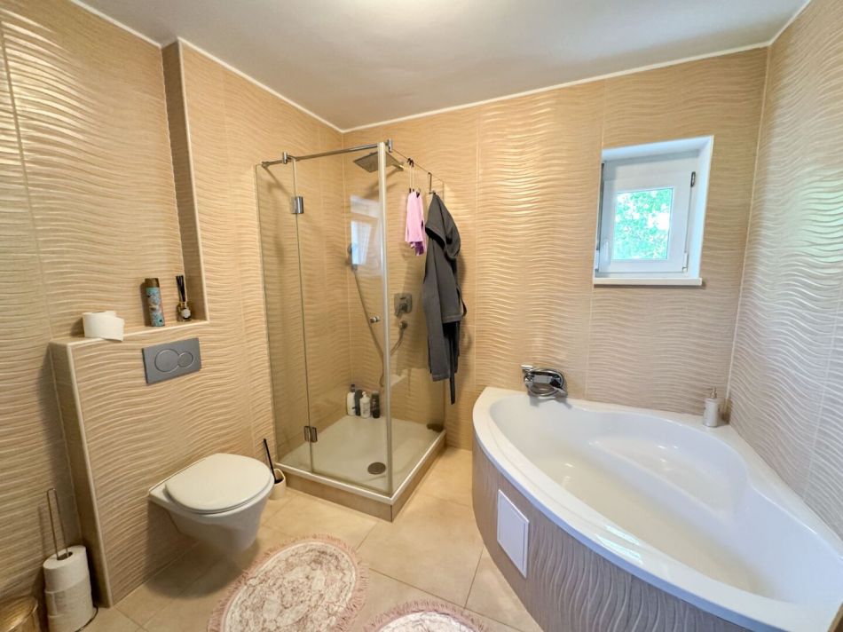 - ein Badezimmer mit Dusche, Badewanne und WC