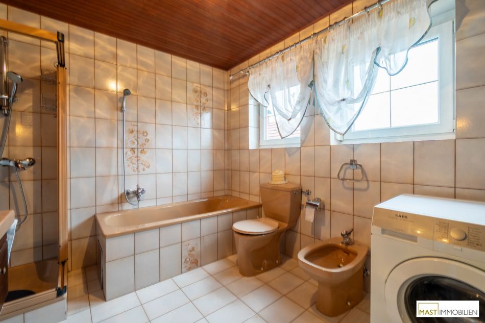 Das Badezimmer ist mit einer Wanne, Dusche und WC ausgestattet.