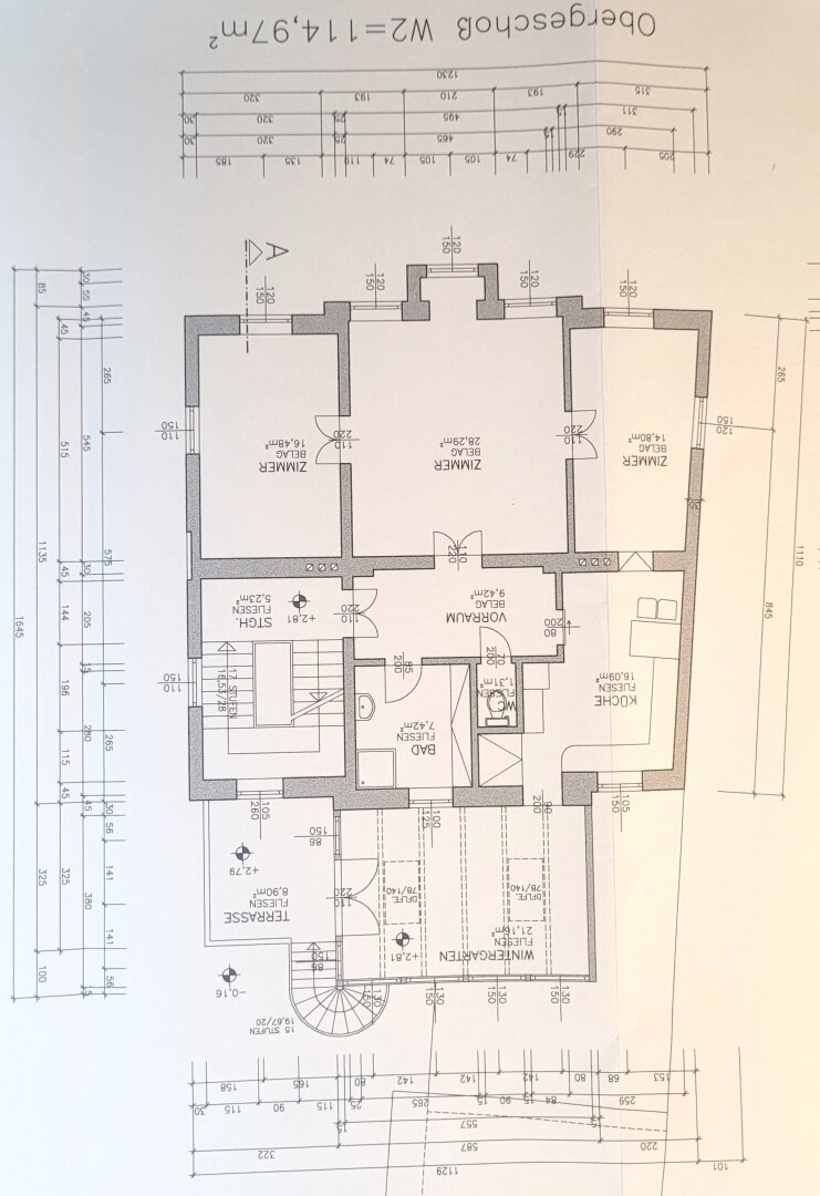 OG: Wohnung mit Küche, Bad, WC und 3 Zimmer sowie Stiegenhaus, Wintergarten und Terrasse