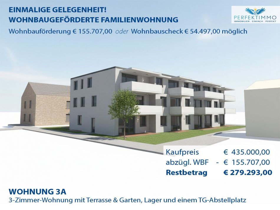 Wohnbauförderung möglich! 3-Zimmer-Neubauwohnung Top W 3 mit Terrasse & Garten sowie 1 TG-Platz *RESERVIERT*