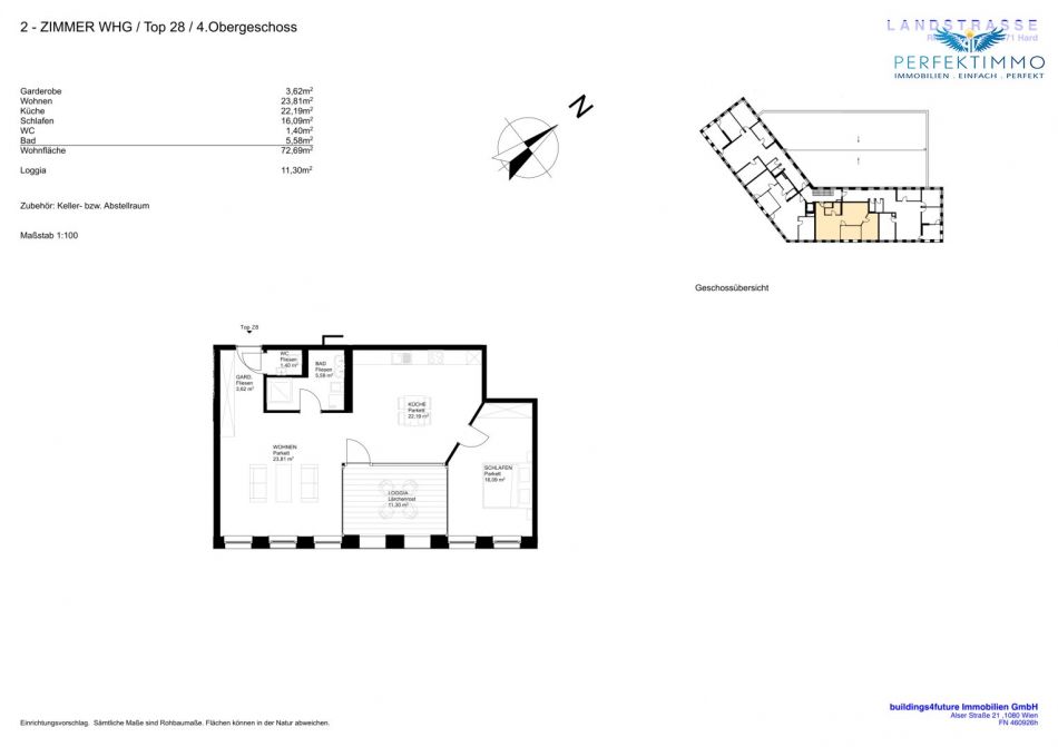 Die Wohnung Top 28 befindet sich im vierten Obergeschoss des neu errichteten Wohn- und Geschäftsgebäudes und ist bequem über einen behindertengerechten Aufzug erreichbar. Auf rund 72,69 m² Wohnfläche bietet sie eine besonders großzügige und gut durchdachte Raumaufteilung. Die Einheit verfügt über eine Garderobe mit etwa 3,62 m², einen großzügigen Wohnbereich mit rund 23,81 m², eine offene Küche mit rund 22,19 m², ein Schlafzimmer mit rund 16,09 m² sowie ein Badezimmer mit einer Fläche von etwa 5,58 m² und ein separates WC mit einer Fläche von etwa 1,40 m². Große Fensterflächen sorgen für viel Tageslicht und schaffen ein angenehmes Wohngefühl. Die großzügige Loggia ist nach Osten orientiert und durch ihre Situierung im Zentrum dieser Wohnung ein absolutes Highlight.