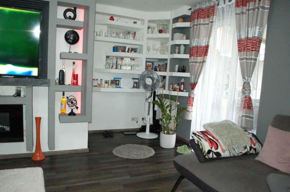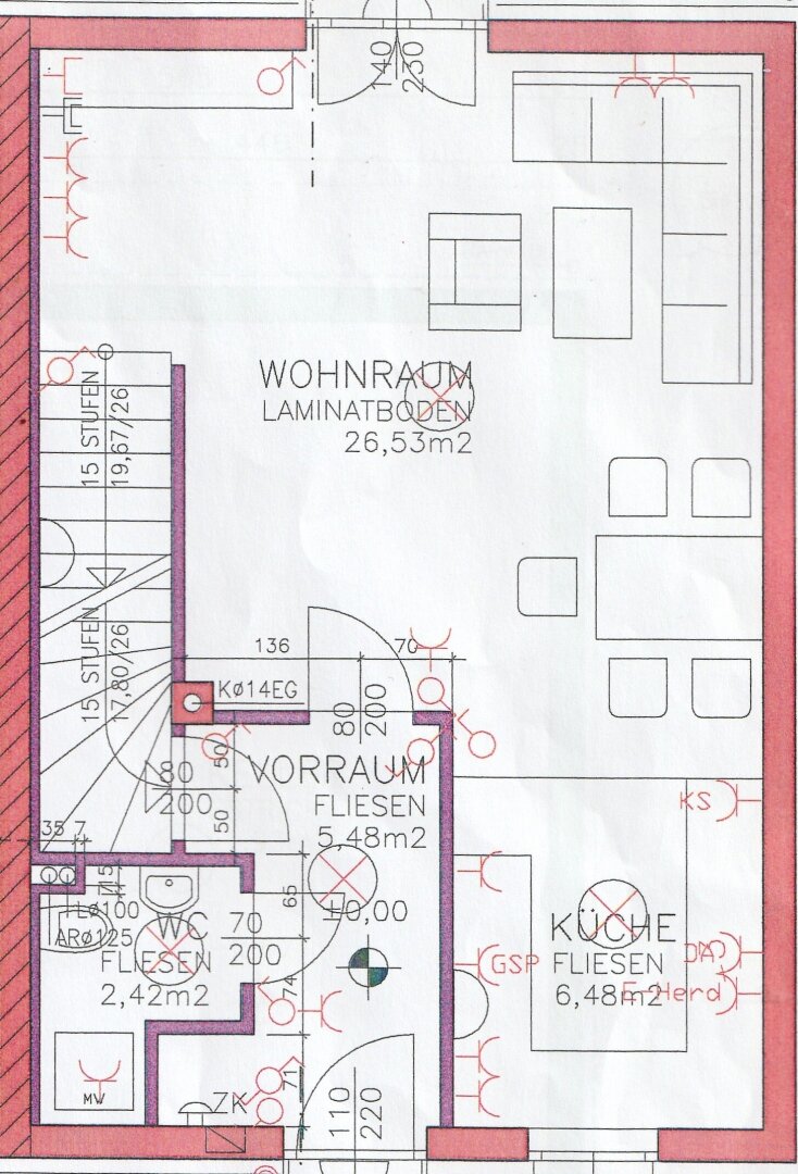 EG: Vorraum, kleines Bad + WC, Wohnzimmer mit offenem Küchenbereich und Ausgang auf die überdachte Terrasse, wo Sie auch an regnerischen warmen Tagen gemütlich sitzen können.