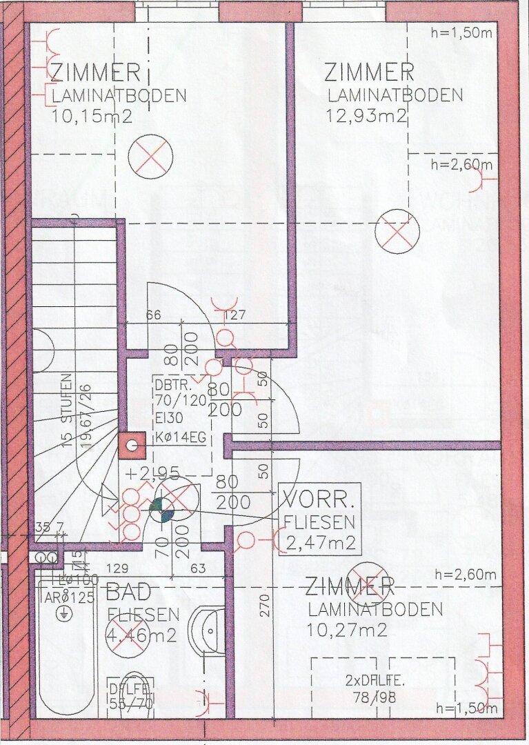 OG: Vorraum, 3 Zimmer, Bad (Wanne) + WC.