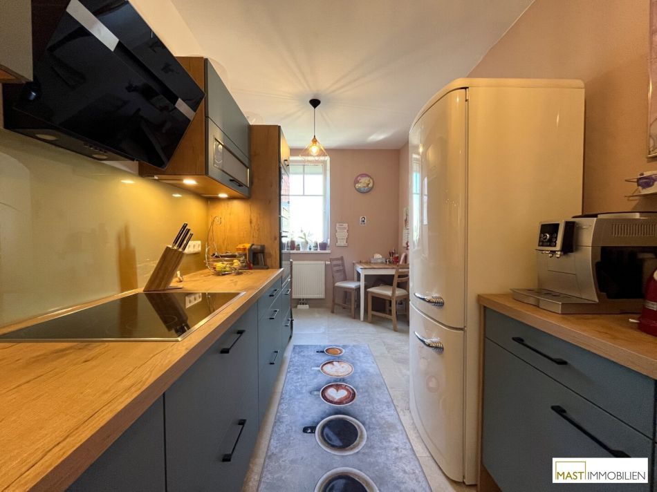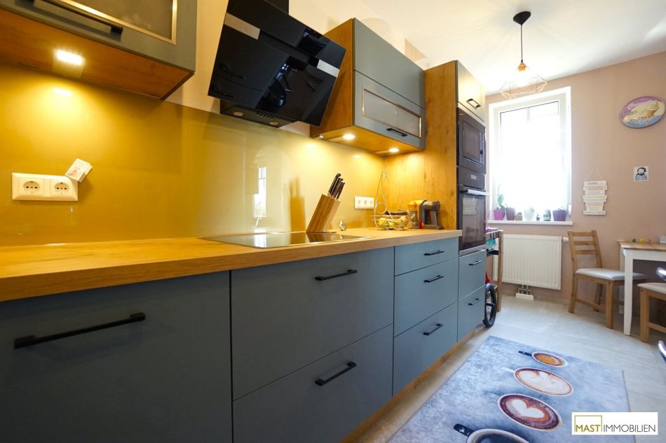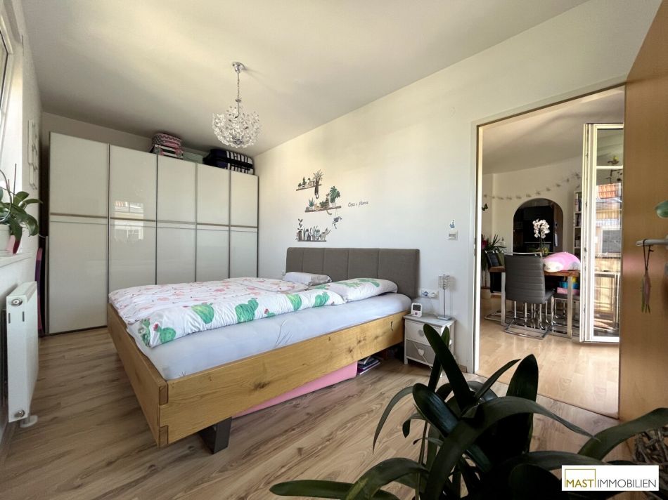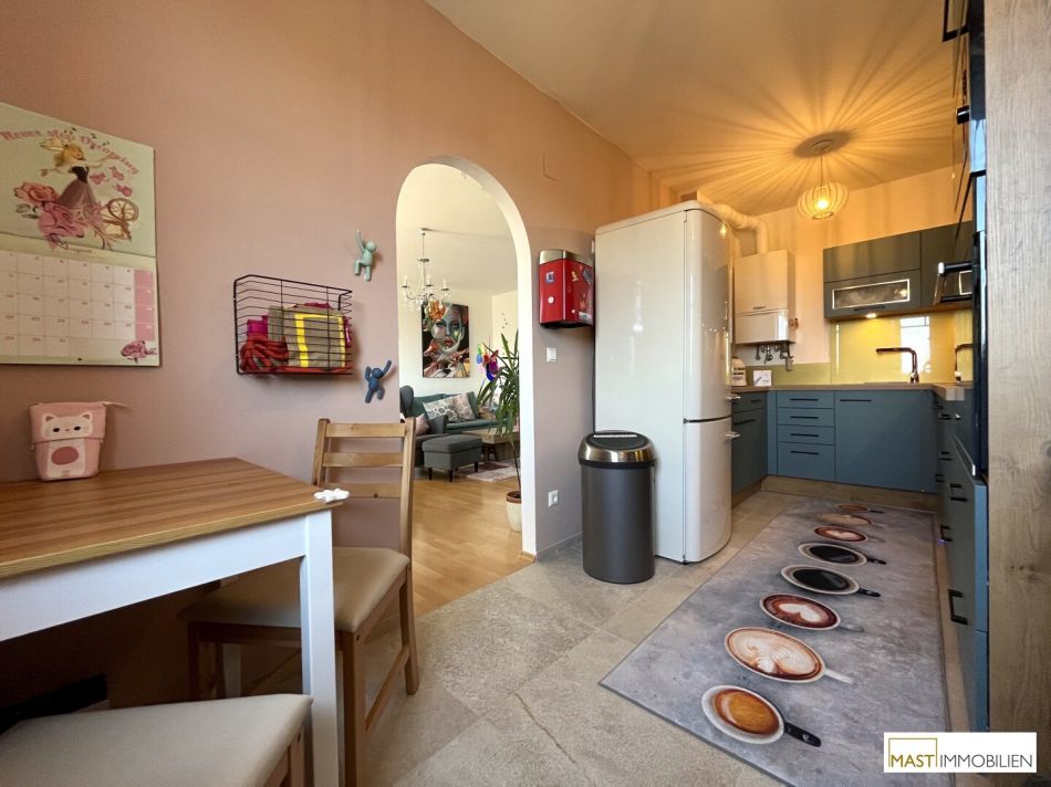 Nach Eintritt in die Wohnung gelangen Sie in ein großzügiges Vorzimmer mit ausreichend Platz für Ihre Garderobe. Das aktuelle Kinderzimmer umfasst eine Fläche von ca. 15 m² und ist direkt vom Vorzimmer aus begehbar. Das separate WC inkl. Waschbecken & Badezimmer ist ebenfalls vom Vorzimmer aus begehbar. Das optimal aufgeteilte Wohnzimmer bietet einen direkten Zugang auf die südlich ausgerichtete Freifläche (Balkon - ca. 4,50 m²). Bei einer teilweisen Sanierung der Wohnung, wurde die alte Küche gegen eine Neue inkl. "DIETER KNOLL Collection" Geräte ersetzt (Wert der Küche liegt bei ca. 20.000,--). Das Elternschlafzimmer mit einer Fläche von ca. 13,40 m² ist vom Wohnzimmer aus begehbar.