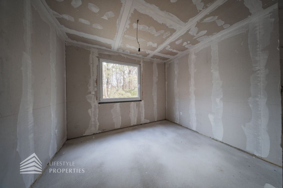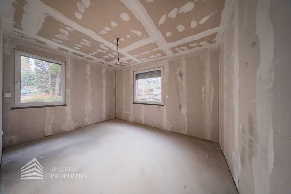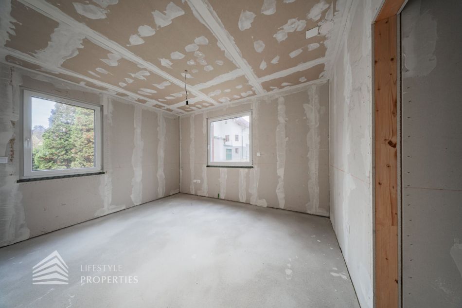 Beim Betreten des Hauses gelangen Sie in einen einladenden Vorraum. Rechts befindet sich ein Technikraum und ein Gäste-WC. Geradeaus öffnet sich ein lichtdurchflutetes Wohn-Esszimmer, wo eine traumhafte Küche Platz finden kann, mit direktem Zugang zur Terrasse und zu dem traumhaften Garten. Rechts liegt zudem ein Gästezimmer, das auch als Büro genutzt werden kann. Auf der rechten Seite führt eine Treppe ins Obergeschoss.