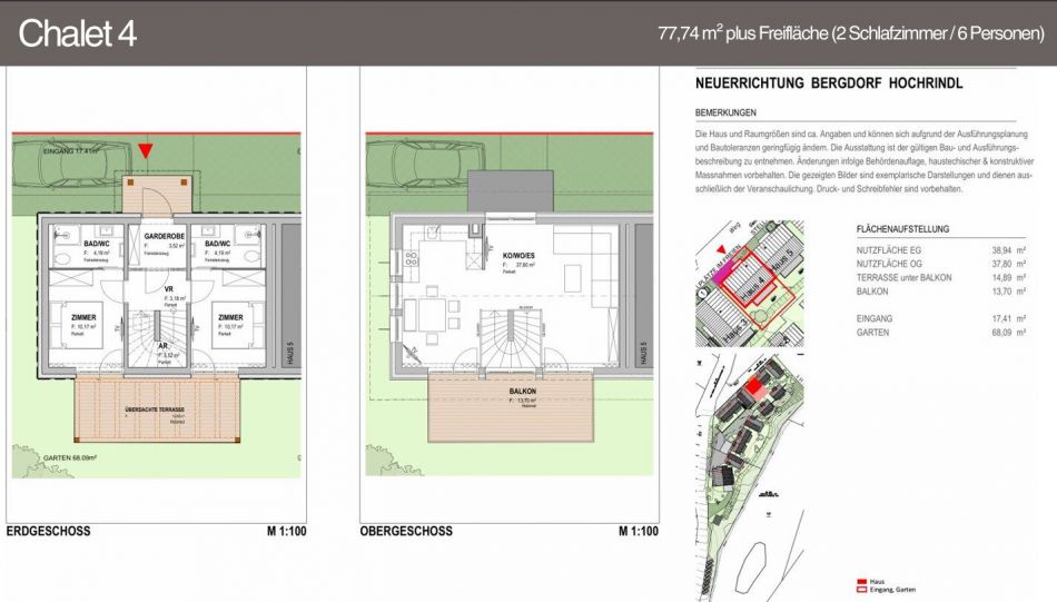 Die Wohnflächen bewegen sich zwischen 76m² - 122m². Jedes Chalet verfügt über einen Balkone, Terrasse und Gartenanteil. 1 KFZ-Stellplatz im Freien ist inkludiert. Stellplätze im Carport können zusätzlich erworben werden. Die modernen Chalets erstrecken sich auf 2 Ebenen und umfassen zwischen 2 und 4 Schlafzimmer. Abhängig vom jeweiligen Chalet befindet sich auf einer Ebene der Wohn-Essbereich und auf der anderen Ebenen die Schlafbereiche. Fast jedes Schlafzimmer verfügt über einen eigenen Sanitärbereich (Bad mit Dusche, Waschbecken und WC). Die Chalets bieten Platz für 4 bis 8 Personen mit jeweils 2-3 Schlafzimmer und einer Ausziehcouch (Wohnzimmer).