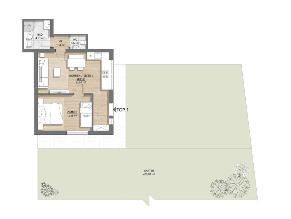 43,48 m2 Wohnung mit 2 Zimmer, ca 400m2 Gartenanteil, 1 Stellplatz und 1 großzügigem AR